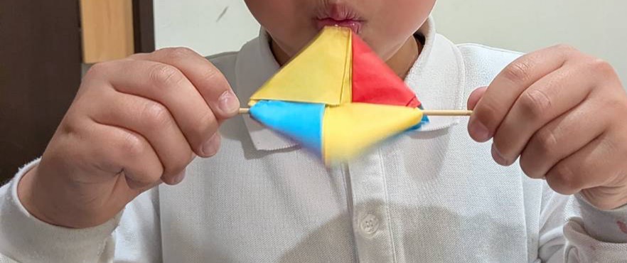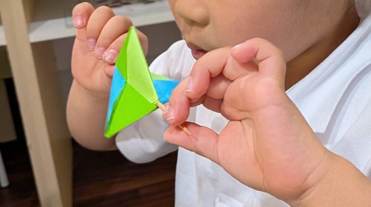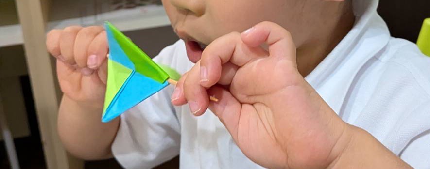 息を吹きかけたり、手で回したり…「自分で作ったおもちゃで遊ぶ」という経験は、子どもたちにとって何よりの喜びです。