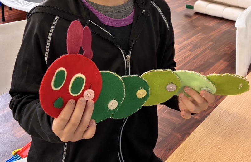 ボタンかけでは、あおむしを長くつなげるために一生懸命指先を使い、大工仕事では道具を巧みに操る真剣な眼差しが見られました。